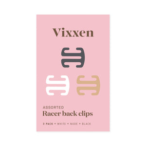 Our must-have Vixxen Racer Back Clips converts any bra to cross back so you can wear your fave bra with racer back singlets, gym tops and cutaway dresses. They come in a pack of three – beige, white and black so you can match your Xback converter to all your bras.